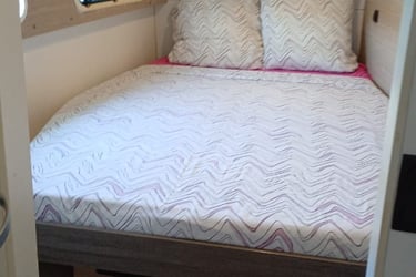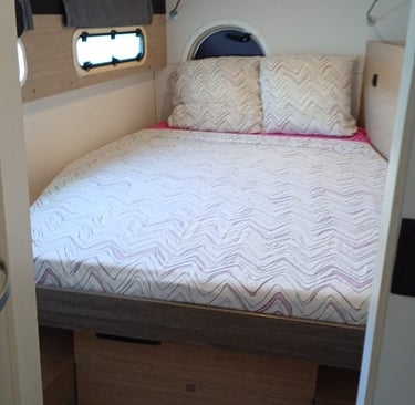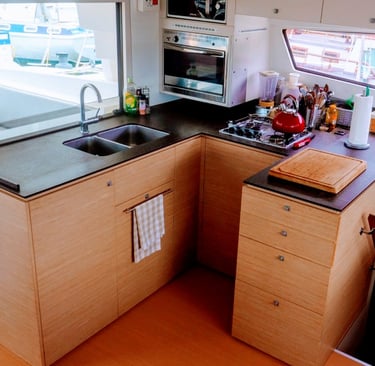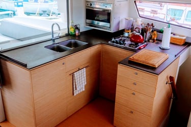 The Open Space concept continues inside, where a sliding aft door and separate window lead from the cockpit to a space where convenience is king. To port is a full galley with an Eno cooktop and separate, eye-level oven and an abundance of countertop space. Each hull has two large cabins with queen-sized island beds. On the port-side each cabin has its own ensuite bathroom with shower and electric toilet while the starboard-side share a larger bathroom, electric toilet and separate walk-in shower.