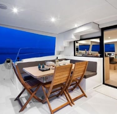 The forward cockpit with dining area and gigantic sunbathing area has replaced the traditional trampoline. The aft cockpit is spacious and entirely flush-decked. There is a port-side dinette and folding table that will seat eight and lounger to starboard.